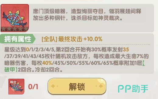 本次重点介绍的暗器是孔雀翎,作为唐门顶级暗器之一,它在外观上呈现出类似折扇的形态,展开瞬间可释放大量钢针,具备极强的穿透伤害能力。攻击速度极快,能在短时间内对多个敌人造成连续打击。当玩家携带此暗器时,全队攻击力将提升10%,极大增强整体输出能力,是团队作战中的核心助力。