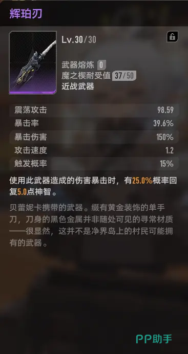 辉珀刃作为前期即可获取的紫色品质武器,拥有非常实用的被动机制——每次暴击有25%概率恢复5点神智值。这一特性极大缓解了角色在战斗中技能释放受限的问题,让玩家能够更频繁地使用核心技能,从而掌握战场主动权。无论用于清怪还是应对精英敌人,都能发挥出色作用。