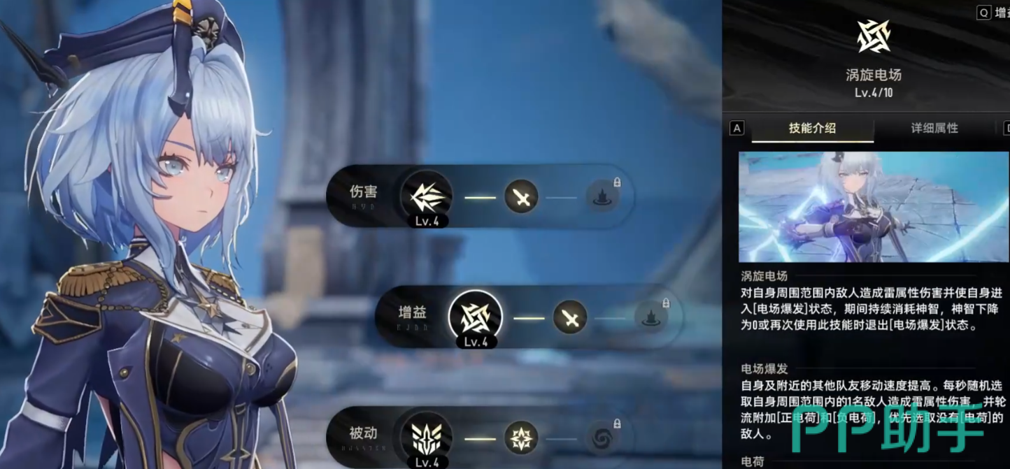 另一项主动技能为涡旋电场,开启后会在周围形成雷电领域,造成范围雷属性伤害,并进入电场爆发状态。在此状态下,技能将持续消耗神智,但能提升自身及队友的移动速度,同时每秒随机攻击范围内的敌方单位并叠加电荷效果。由于该技能不消耗电能,非常适合在面对群体敌人或BOSS战时提前开启,既能辅助团队提速,又能稳定积累电荷,为后续技能衔接创造有利条件。