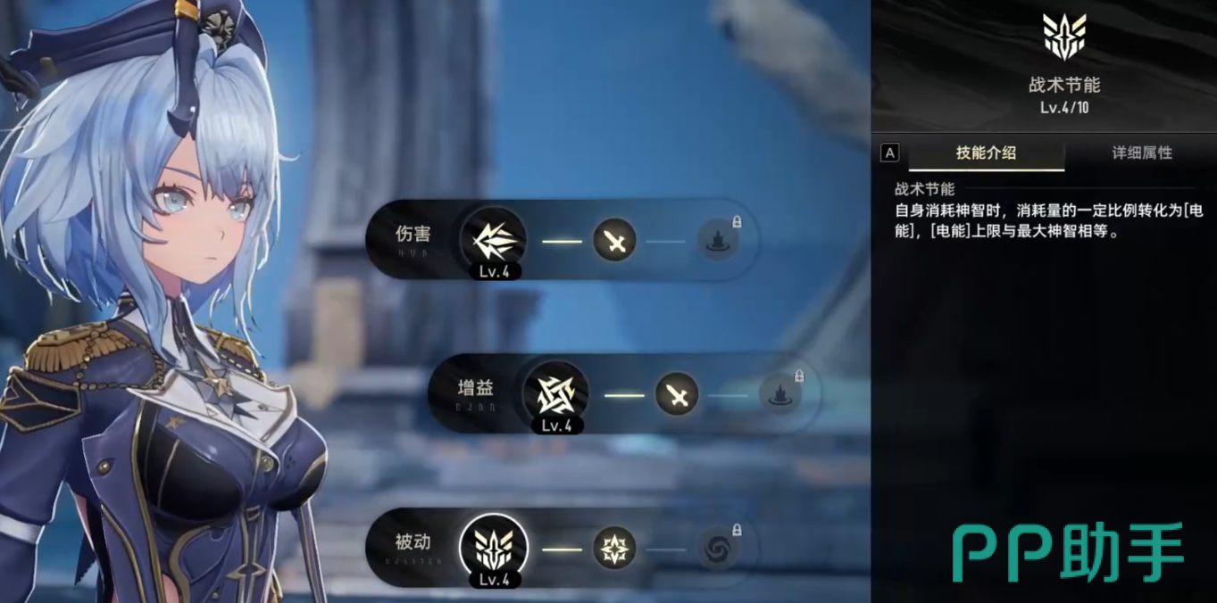 首先来看她的被动技能——战术节能。当黎瑟使用技能消耗神智时,会将一定比例的神智转化为电能。电能的最大值与角色当前的最大神智数值相等,因此提升神智属性不仅能增强续航,还能显著提高电能储备,为后续爆发输出打下基础。另一个被动名为电量焦虑,能够在消耗电能的同时,将消耗量的50%返还为神智。这一机制实现了资源间的循环利用,有效缓解了战斗中能量枯竭的问题,确保持续作战能力。