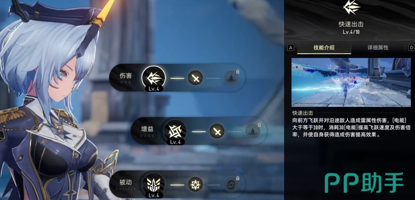 她的主动技能之一是快速出击,释放后可向前方进行位移,对路径上的敌人造成雷属性伤害。当电能不低于30点时,该技能可额外消耗电能来提升移动速度、伤害输出,并附加增益状态。此技能既可用于追击敌人,也可作为机动手段快速转移位置。若用于清怪或输出,则建议在电能充足时施放,以最大化其威力。