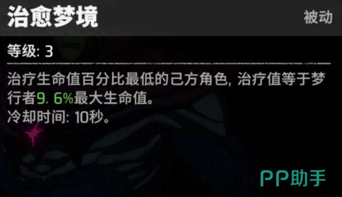 首先是治疗梦境。这个被动技能,那么它可以治疗生命值百分比比较低的角色,治疗值可以等于梦行者最大的生命值,机能的冷却时间为十秒钟,那么还有一个自动治疗,它的治疗量是和自己角色生命值相挂钩的,除此之外,还有攻击的技能,比如说扭曲梦境这个技能,可以带给大家特殊的伤害,这个终极技能也可以不断的释放能量消耗范围性是非常大的,之后就是梦之力,这个技能可以来不断的增加伤害,增加单次的技能,直到战绩全部消失之后,是对终极技能无效的,还可以增加单体角色释放梦境的能力。