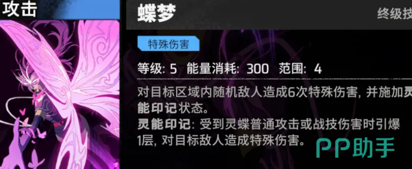 大家只能够接近敌人来造成特殊的伤害,无视对方护盾的效果,接着就是战斗技能意识化蝶,这个技能也是可以移动到目标敌人的位置,来对左右双方敌人造成特殊的伤害,还可以获得谍影,提高整体的伤害,这个技能会持续十秒钟的时间,大家可以来选择落点的位置,增加范围性的伤害,玩家们在使用的过程中,可以搭配高光时刻和神器来进行使用,还有一个专属卡也可以来获得增益的效果,选择神器的过程中,可以选择一个增加攻击,一个增加暴击的神器。