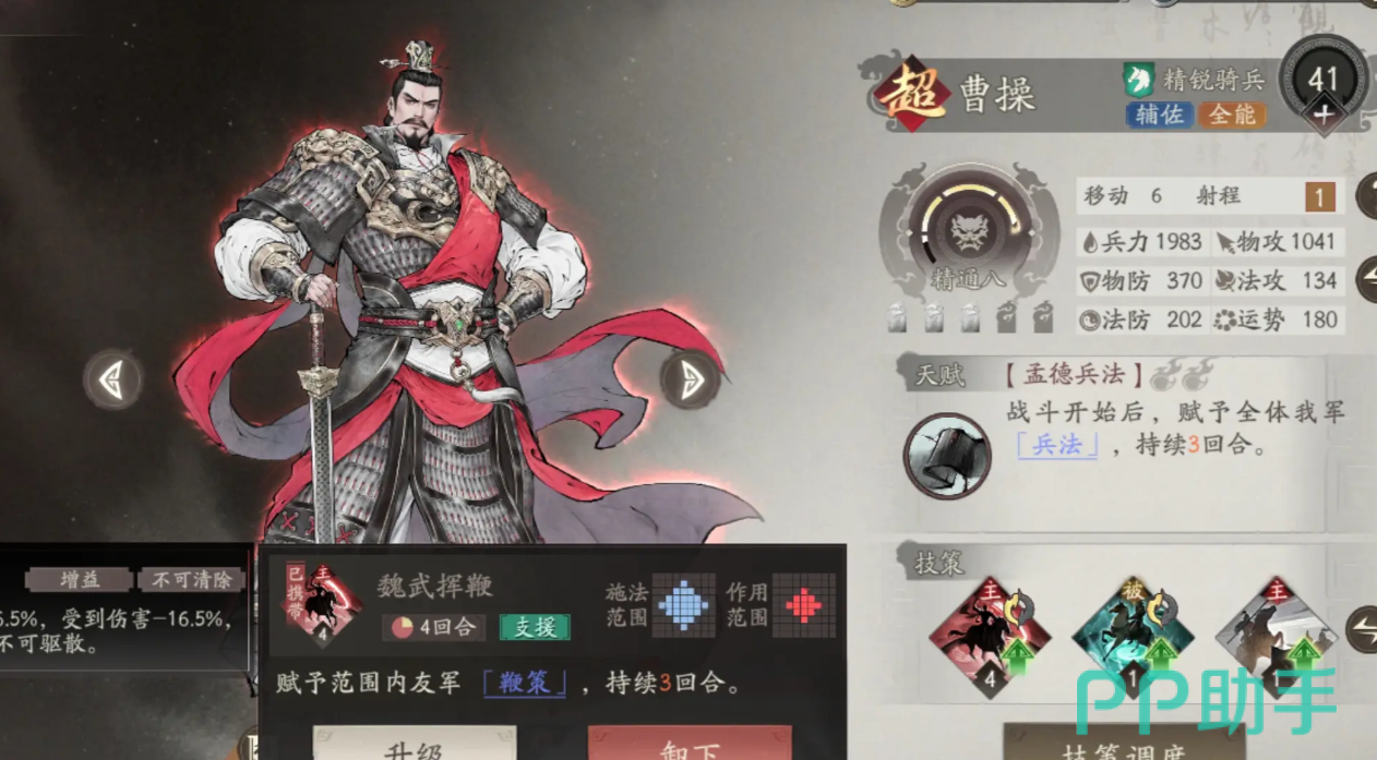 曹操是一个全能性的统帅武将,兼备输出能力和提供增益的效果,核心优势是,他能够整体性的为团队提升15%的基础攻击倍率,在进入到三阶段时,还能够为团队提升10%的免伤效果,并且,和曹操一同战斗的主将单位将有30%的概率触发连击效果。