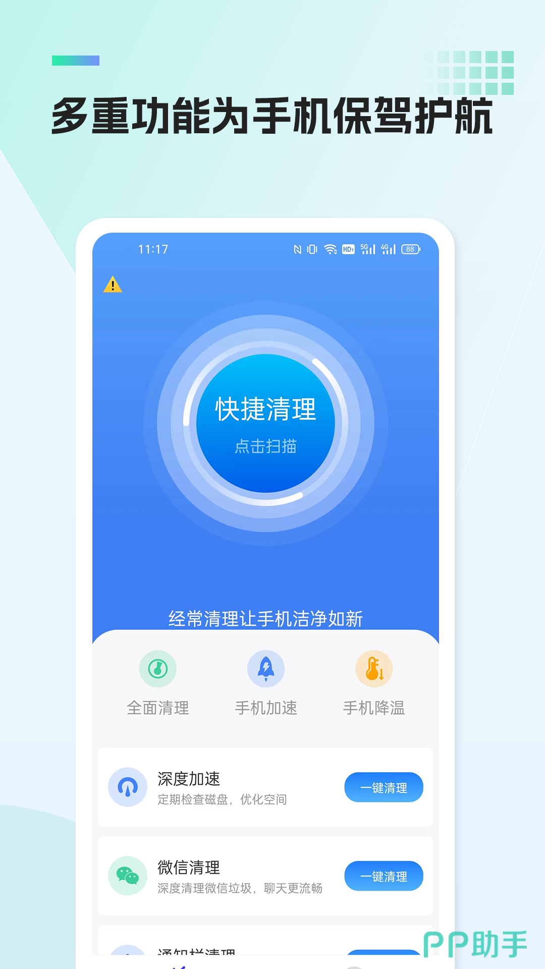 超强手机清理体积小巧却涵盖病毒防护、内存优化、设备降温等核心功能。其病毒查杀功能快速精准,能实时监测应用安全,防止恶意软件入侵。内存加速功能通过智能分析后台进程,关闭非必要程序,提升手机响应速度。最具特色的是其降温机制,能实时监测CPU温度,当设备高负载运行导致发热时,自动关闭高耗电功能,降低设备温度,保障长时间使用的稳定性。