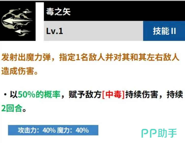 戈登是一个使用毒系魔法和敌人战斗的角色,他的技能全部都和毒系魔法有关哦,主动技能分贝是毒之枪弹和毒之矢,毒之枪弹可以发射出带有毒系魔法的球体,该球体会对1个敌人进行攻击,攻击后又40%的几率给敌人套上中毒的状态,毒之矢则是能够向指定的敌人发射出魔力弹,该技能最大的优势就能能够指定攻击目标,并且魔力弹还能够对敌人以及敌人左右的队友造成伤害,技能一旦打中目标就会有50%的可能性给敌人附加上中毒的状态,且该状态能够持续2个回合。