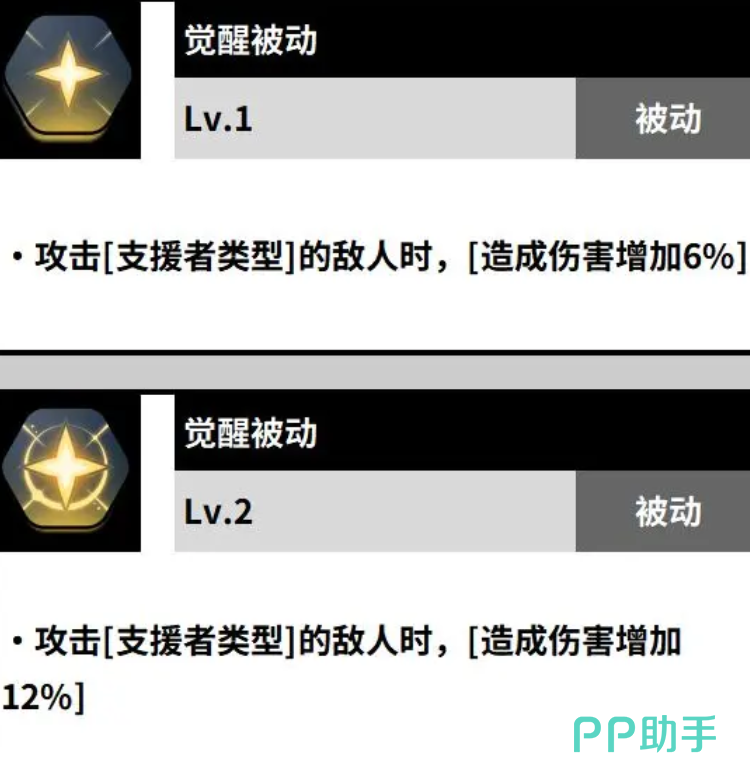 觉醒被动技能主要是戈登去攻击支援者类型的敌人时会被触发,触发后能够给敌人造成的伤害再增加6%,觉醒被动技能在升级到2级后,在去对支援型的敌人进行攻击时,所造成的伤害会增加12%。