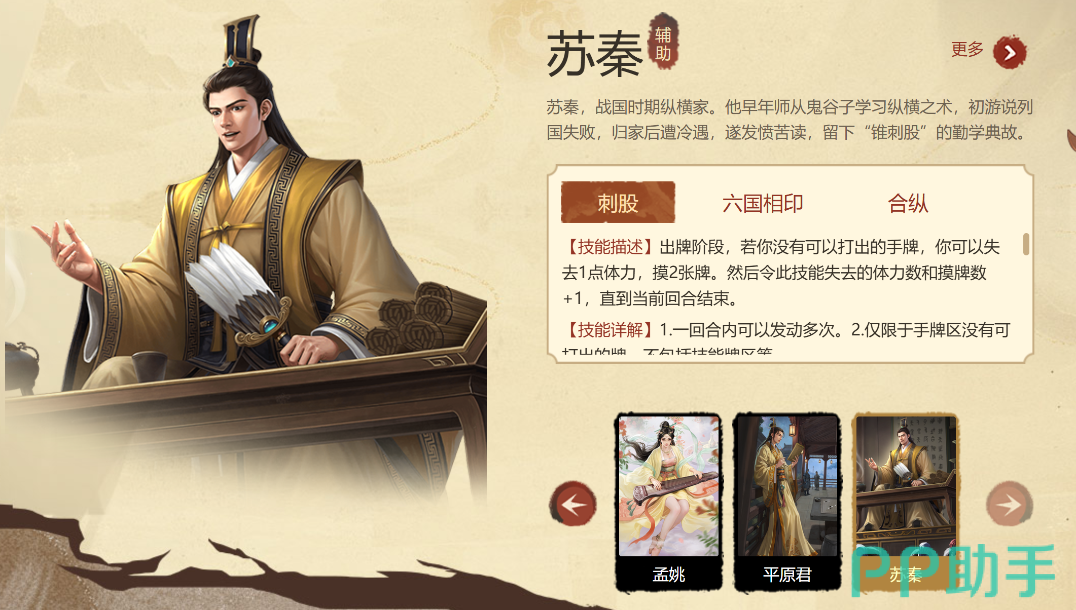 在《名将杀》这款策略卡牌游戏中,苏秦是一位兼具智慧与谋略的多势力武将,他凭借灵活多变的技能组合,能够在战场上快速积累优势。许多玩家初次接触这名角色时,往往会疑惑:名将杀苏秦技能是什么?实际上苏秦的三个技能“刺股”、“六国相印”、“合纵”相关联,体现了他作为纵横家代表的谋略,还让他在游戏中有高策略深度,无论是在资源增加、势力转换还是团队配合上,他都能表现得令人惊喜。