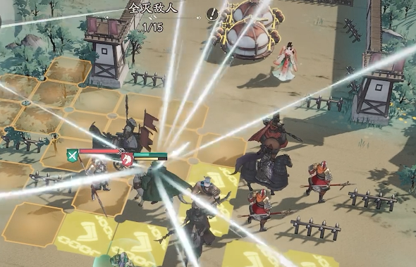 战斗开始后,敌方单位会从前方入口陆续刷新,前排角色会自动迎战,袁绍也会参与远程输出。需要注意的是,在前几波敌人进攻期间,后方可能会出现远程攻击型敌军,此时需由夏侯兄弟主动出击,吸引火力并迅速将其清除,防止对袁绍造成威胁。