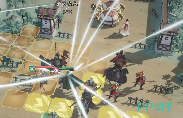 进入战斗后,袁绍会出现在地图中央的祭坛位置,玩家的核心目标是确保他不受到任何伤害。部署时,建议将夏侯兄弟安排在袁绍身后的出口处进行警戒,其余角色则布防于前方入口区域,形成前后双层防线。