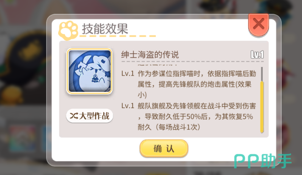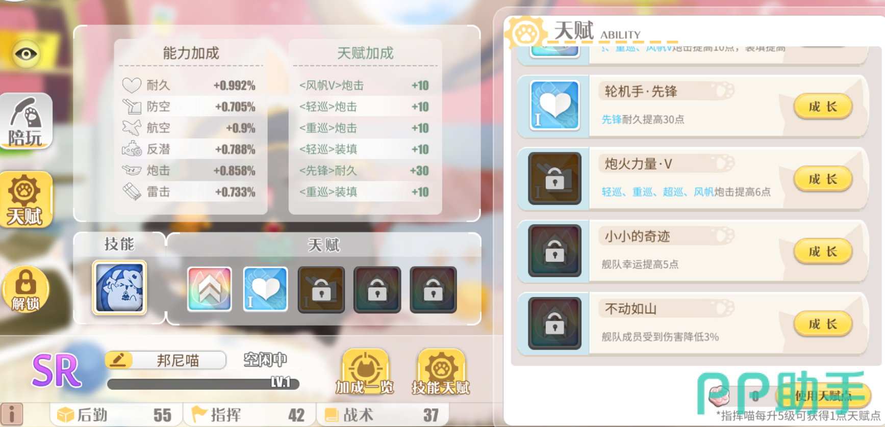 从属性配置来看,邦尼喵侧重于后勤类增益,在耐久、炮击以及航空方面提供较为可观的加成。其拥有的固定天赋包括:不动(全队减伤3%)、战旗重扬(提升轻巡、重巡及风帆舰种的炮击与装填各10点)、小小的奇迹(舰队幸运值+5)、炮火覆盖V(增强轻巡、重巡、超巡及风帆单位的炮击能力),以及轮机长·先锋(先锋编队成员耐久增加60点)。