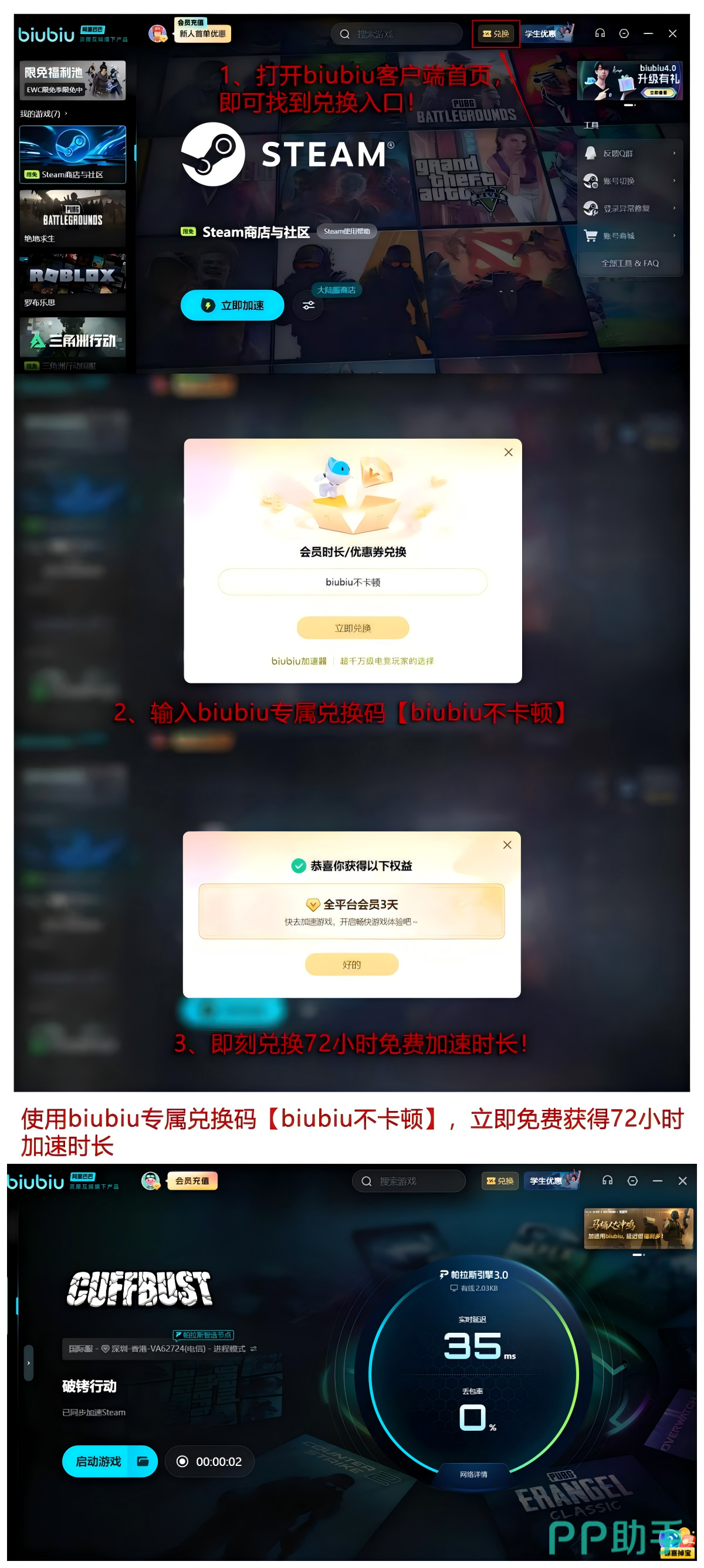 在【兑换】页面输入口令【biubiu不卡顿】,即可领取3天免费加速服务,并且如果是新用户注册登录,还将额外获赠24小时使用时长,合计可享受96小时的免费加速体验。将加速器挂机运行,能有效实现低延迟、零丢包的联网环境,充分感受cuffbust多人联机的乐趣。