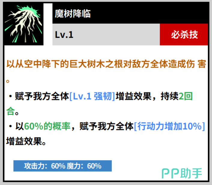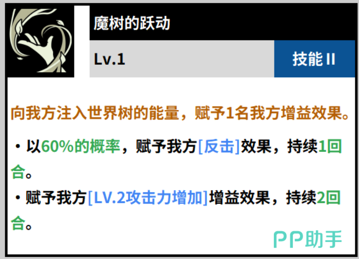 第二个技能“魔术的跃动”则依赖于独特的“大树能量”系统。玩家需在前期逐步积攒能量值,一旦满足条件即可释放该技能,为我方全体成员提供显著增益。其中,攻击力提升幅度高达84%,持续两个回合;同时附加65%的攻击速度加成,同样维持两回合。值得注意的是,攻击增益优先作用于单一主力输出角色,建议集中强化队伍中的核心DPS单位。