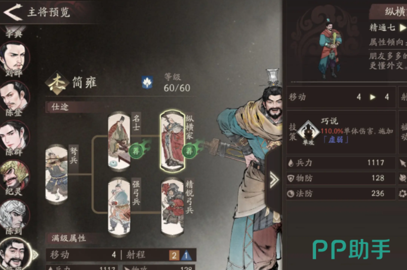 第3个推荐的角色则是简雍。它的主要作用是收割和策反,当施展计策劝降之后,可以直接策反敌军。如果敌方的身上有减益buff,还可以对敌方造成额外伤害。在实战中,小编建议玩家让郭嘉先手,当触发溃逃效果,使全队获得攻击加成之后再让程昱出场,把中毒和定身这两个减益buff都叠加给敌方。简雍可以作为压轴出场,让他出来收割残局,并且把剩余的敌军策反。