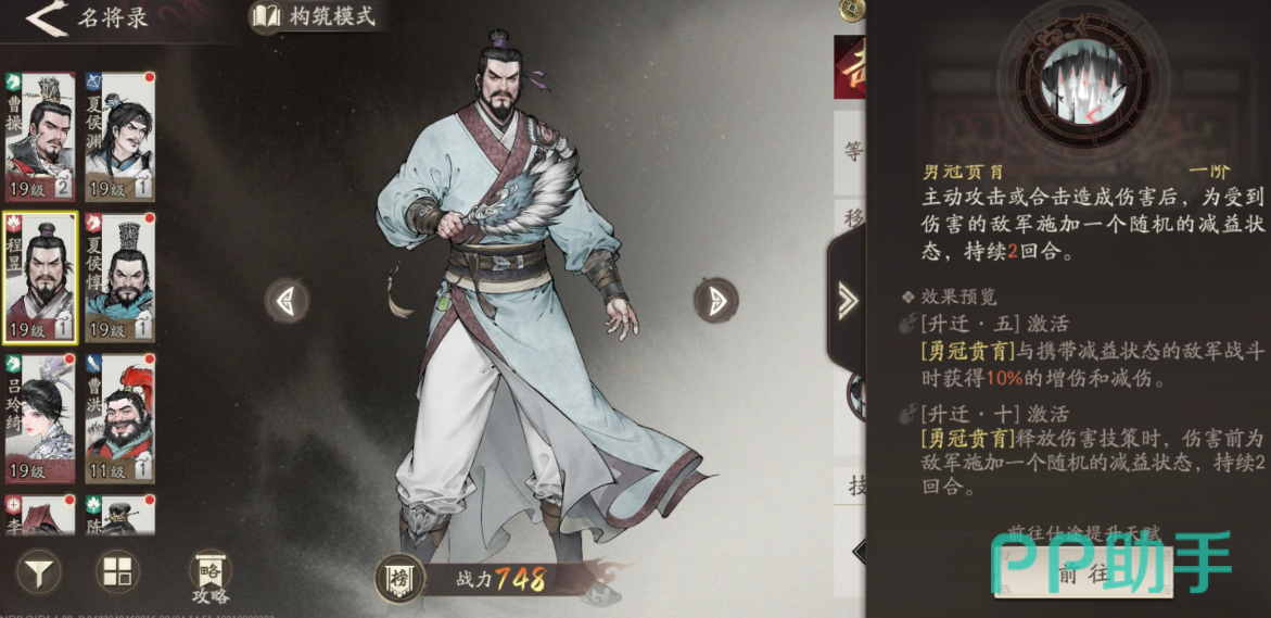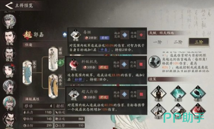 如果想玩策士阵容的话,那么郭嘉就是必须要培养的一个角色,他也将会是这个配置中的核心。他的被动技能天妒鬼才,能够为自己和其余所有的队友提供伤害加成,计策的附加效果溃逃,则可以对敌方所有成员造成持续性的伤害。郭嘉的技能基本上都是以群攻为主的,因此伤害也较为可观。小编推荐的第2个角色是程昱,他是一个召唤型的角色,施展技能十面埋伏之后,可以召唤出步兵进行攻击,同时还可以对敌方叠加中毒和定身的效果,因此在控制这方面也很不错。