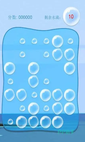大家需要通过10个小水滴把水滴放到圆形的水滴中,水滴就会变大,当给圆形水滴增加一个水滴时,让它爆炸就会变成四个飞溅水滴扩散开,大家需要想办法让水滴变成水泡,水泡爆炸后向四周扩散就能造成连锁的爆炸,连锁的报价会获得更多的分数,还是蛮考验大家的规划能力的。