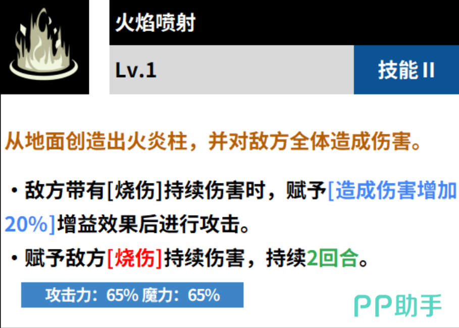 第二个技能是【火焰喷射】,可从地面召唤出多道火焰柱攻击全体敌人。若目标已处于烧伤状态,则此技能将额外提升20%伤害,并延续原有的烧伤效果。该技能的基础攻击力与魔力加成均为65%。