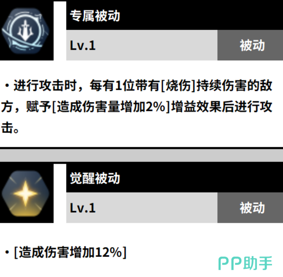 利奥波德的专属被动技能使其在每次攻击时,只要命中带有烧伤状态的敌人,即可提升20%伤害输出。觉醒后的被动技能在1级时提供12%的增伤,升至2级后增伤效果提升至25%,显著增强持续作战能力。