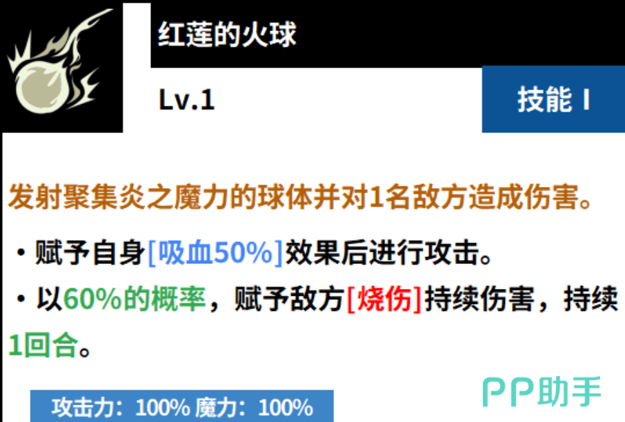他的第一个主动技能为【红莲的火球】,能够释放由炎之魔力凝聚而成的火属性能量球,锁定单个敌方单位造成伤害。该技能不仅具备100%攻击力和魔力加成,还能为自己提供50%的吸血效果,并有60%概率使目标陷入烧伤状态。
