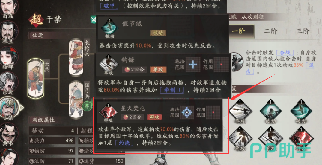 于禁的主动技能“星火焚屯”冷却时间为两回合,属于群体攻击类技能。首次命中单体目标时造成等同于自身物攻70%的伤害,随后向周围十字区域扩散,对范围内的敌军造成30%物攻的溅射伤害。