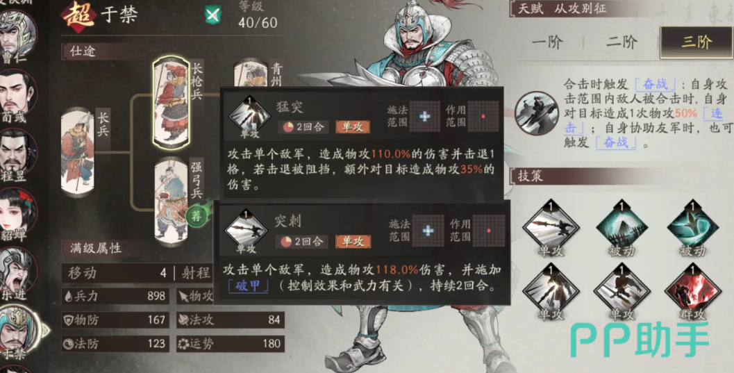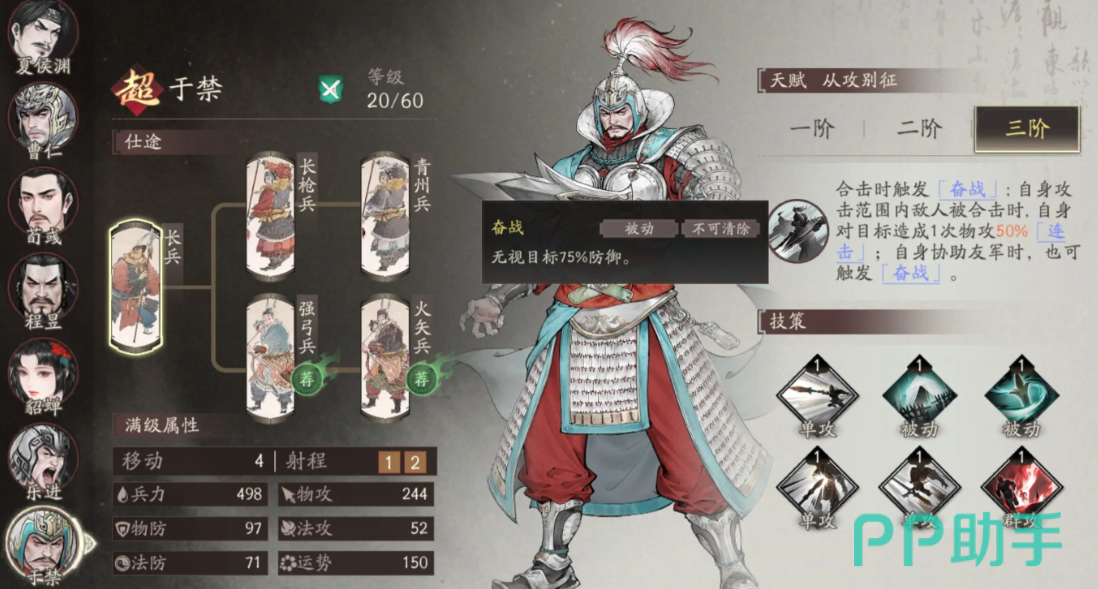 于禁的职业定位为远程骑兵,三阶技能“奋战”可无视目标75%防御力,在释放合击技时,额外触发一次相当于自身物攻50%倍率的连击伤害。这一机制使得他在协同作战中既能辅助队友,又能独立打出可观输出。