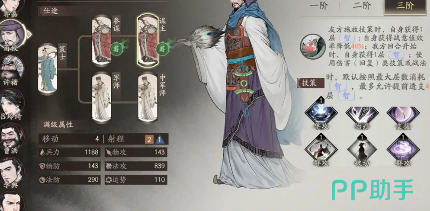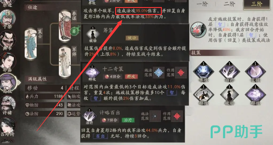 此外,荀彧还拥有名为“计谋百出”的辅助技能,冷却时间为七个回合,可在自身周围两格菱形区域内生成一个光环,基于自身44%的法术攻击力持续为友军单位恢复生命值。配合杜氏的天赋“温雅”,该治疗效果可提升16%,同时杜氏提供的73点法术攻击加成也能进一步放大技能伤害与治疗量,形成良性循环。