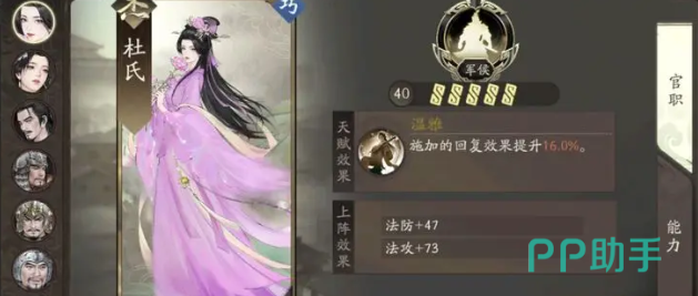 作为辅助类武将,杜氏的核心优势在于其天赋“温雅”,该效果可使主将释放的恢复类技能效果提升16%。此外,在上阵状态下,她能为全队带来47点法术防御和73点法术攻击的固定属性加成。这一特性使其特别适合作为法术输出型主将的前期搭档,尤其对依赖技能持续作战的谋士型角色增益显著。