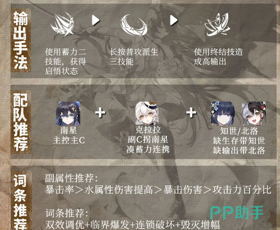关于装备副属性的选择,推荐优先级为:暴击率 → 水属性伤害提高 → 暴击伤害 → 攻击力百分比。由于南星的所有技能均以水属性为基础,因此提升水属性伤害可直接增强全部技能输出。暴击率建议堆叠至50%以上,确保输出稳定性,减少未暴击造成的伤害波动。随后补充暴击伤害以拉高极限输出上限,最后通过攻击力百分比强化基础数值。特效词条方面,双效调优和临界爆发为最优选,前者优化技能衔接流畅性,后者进一步放大爆发窗口期的伤害表现。