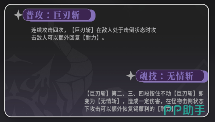 尽管锡蒙利并非SSR稀有角色,但她在实战中的表现却远超许多高稀有度单位。她以耐力循环为核心机制,普通攻击“巨刃斩”为四段连击,基础伤害稳定,且在击倒敌人时可恢复自身耐力;若长按释放第二至第四段,则会升级为魂技“无情斩”,不仅伤害显著提升,还能额外回复魔力值,增强持续作战能力。