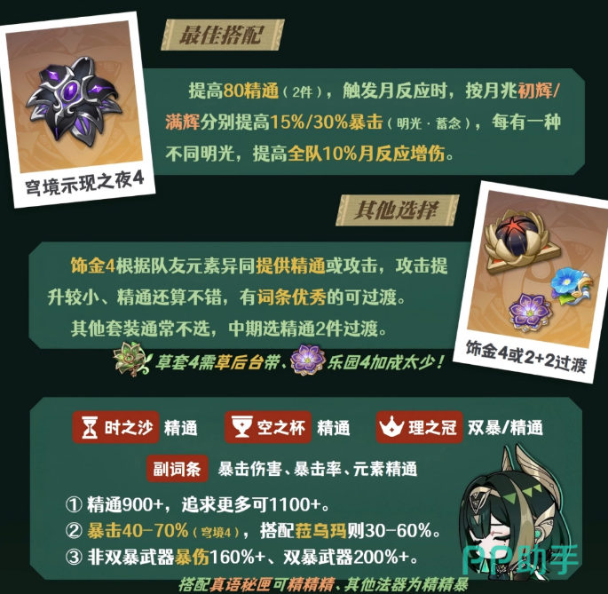这一组合的优势在于显著提高暴击覆盖率,同时让精通收益最大化,非常适合以月绽放为主要输出手段的角色构建体系,在当前版本下能充分发挥奈芙尔的潜力。