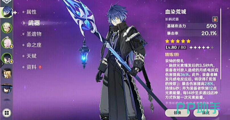 专武“血染荒城”无疑是最佳选择,其被动完美契合菲林斯的能量循环与爆发需求;其他可用长柄武器包括赤沙之杖、支离轮光等。若暂无上述武器,也可使用西风大剑、锻造类武器如万能钥匙或拾慧铸熔进行前期过渡。