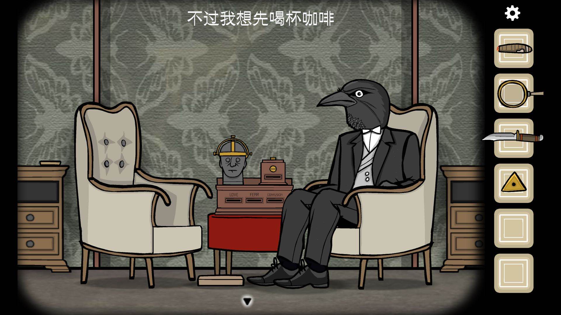 乌鸦先生喝了咖啡之后会往地上的书吐一口黑色的口水,接着上面就会出现5个心理测试的图片,这就是下一个谜题:录音带的顺序。