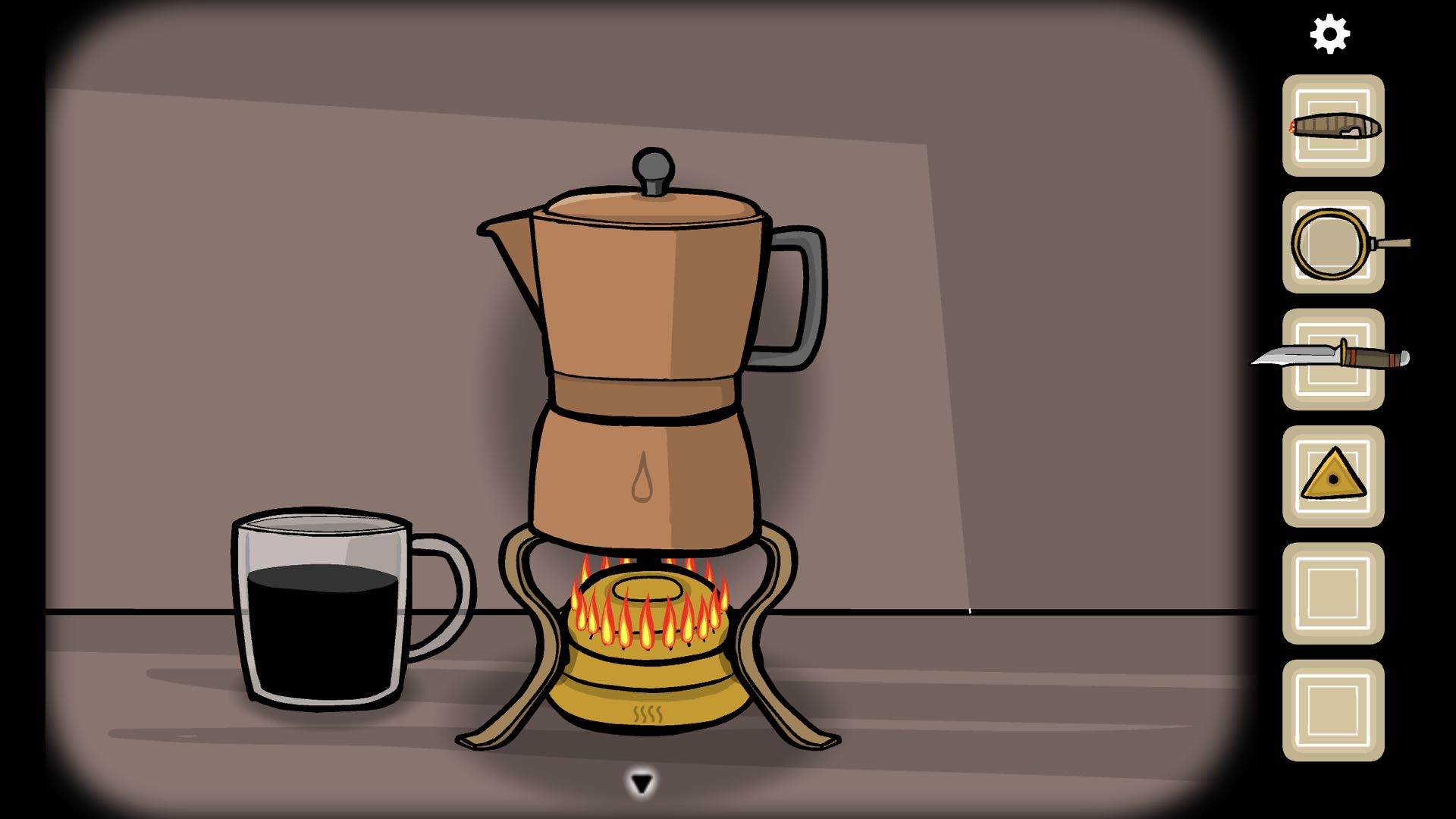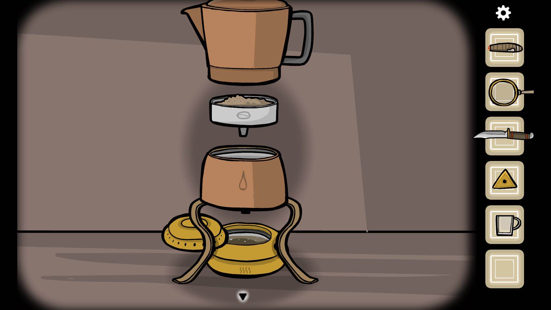 第三步:查看大柜子中的黑色书可以看到其中有一页就写着如何制作咖啡,需要的就是我们获取的三个道具,先把水装入咖啡机的中间,把油墨装到最底部,把咖啡豆装在水的上方,然后用香烟点燃下方的油墨就可以制作咖啡了。(最后点击一下咖啡机再把杯子放上去)