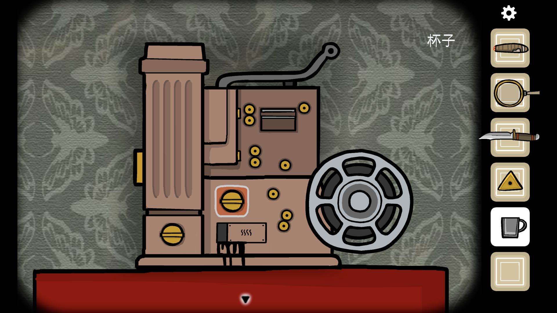 第二步:去放映机这里,点击下方的移动开关两次就会流出油墨,这个东西是用来点燃咖啡机下方的火焰的,接着去器官瓶子那里用杯子打一杯水上来,这样我们就获得了三个道具,分别是咖啡粉、燃料用的油墨、一杯水。