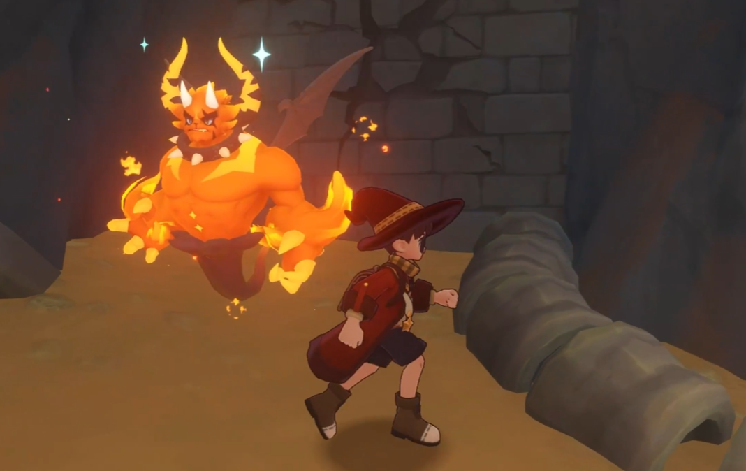 首先来到紫色大锅的位置,会得知必须集齐3个矿石晶块才能换取钥匙,用于打开后方的大门。建议先向左侧前进,途中会看到两面石墙。使用精灵攻击其中一面,将其击碎以开辟新的路径。
