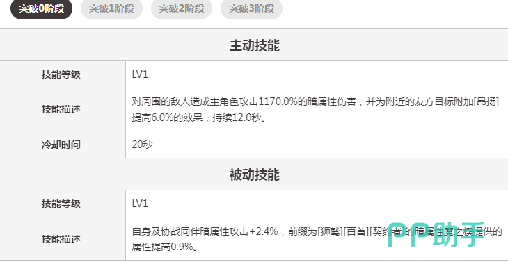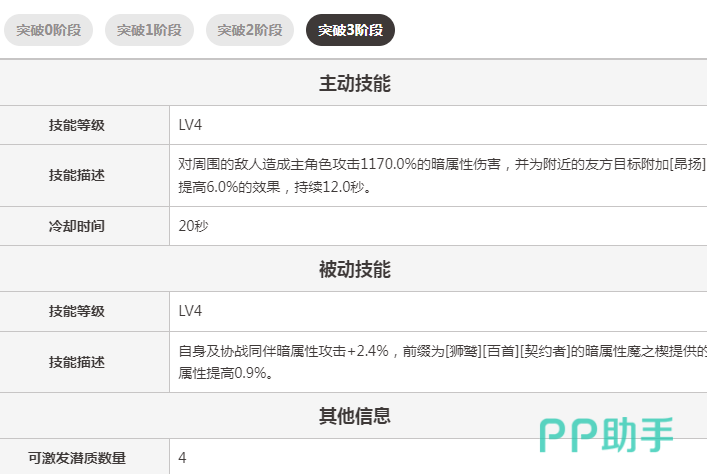 被动技能对于暗系队伍来说也是一个隐藏的福利。可以给协战的同伴还有自己提升2.4%的暗属性攻击,并且针对特定的魔之楔还有额外的加成,只要前缀为契约者或者狮鹫的暗属性,全部都可以提升0.9%的属性。这就意味着一旦在组建成暗系阵容之后,只要合理的搭配,就可以让队伍的属性形成一个叠加的优势。无论是纯暗队还是混编暗系阵容,这都是一个核心的辅助并且兼具输出。