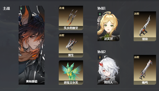 艾拉作为副输出,在近战攻击时就可以吸引一部分的怪物仇恨,避免被主c围殴。这一个阵容相对来说比较稳定,而且输出也是比较有优势性的,在打副本或者是委托时效率会比较高。当然这并不是唯一的阵容,玩家也可以考虑其他的阵容,例如选择主战过渡阵容。