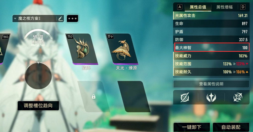 魔之楔的选择方面,左右位可以搭配幻景同属性的魔之楔,同时,提升自身的最大神智,例如天光燎原、陷阵等等,并且,所有近战单位的神智型魔之楔,以及技能威力型魔之楔,都能够成功搭配给幻景。