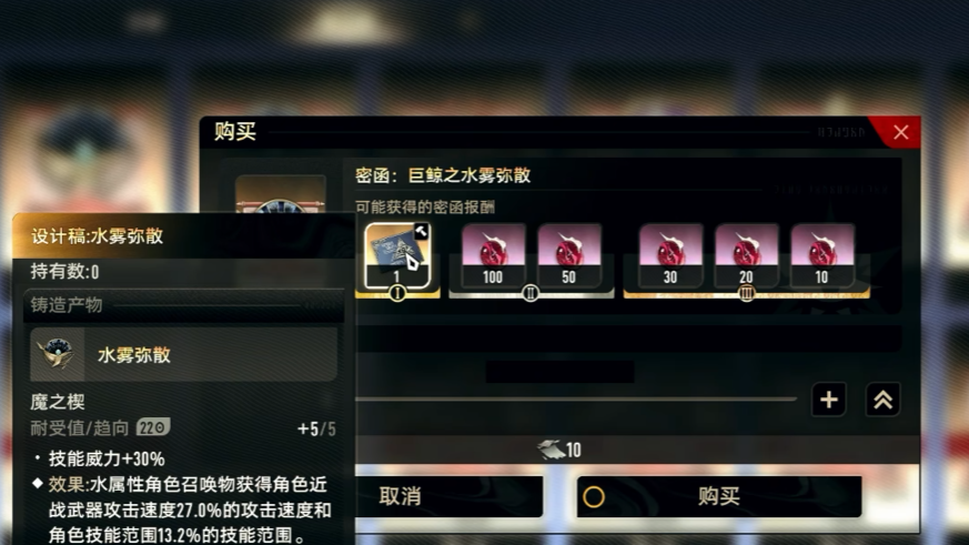 幻景魔之楔的毕业套装是“水雾弥散”,能够直接增加技能威力30%,同时,切换武器时,还能够提升输出倍率,是游戏内加成比较高的一个魔之楔了,但是该魔之楔需要通过密函任务来获取,随后收集材料进行打造。