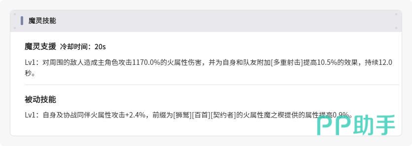 作为一个火属性的魔灵角色,在对战的过程中,可以对角色周围的其他成员带来火属性的伤害,并且每一次进行攻击,还可以给队友里的其他成员附加多重的射击提升效果,能让整个队伍的战斗能力都变得更强一些,并且每一次对战的时候除了主动技能之外,还会拥有额外的被动技能,首先就是,这个角色可以利用自身的被动技能,提升其他火属性成员的攻击能力,另外在战斗的过程中,如果联合了其他的火属性角色,那战斗力还能得到额外的0.9提升,非常适合喜欢火属性角色的成员,选择这个魔灵进行搭配。