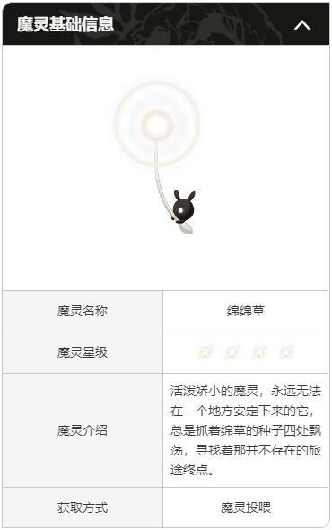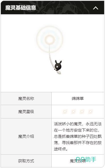 绵绵草是游戏里带有强力治疗的一个辅助魔灵,虽然星级只有四颗星,但是除了治疗之外,还会拥有一定的防御能力,要获取这个魔灵也很简单,玩家可以通过魔灵的投喂获取,得到这个魔灵之后,就可以把他放在队伍中,每一次战斗的时候,都能让角色能力得到提升,在对战的过程中,主要角色可以受到这个魔灵30%的生命值治疗,另外在这个基础上还会带来10%的防御,每一次可以持续15秒的时间,下一次想要使用的话,需要再一次间隔30秒,利用这项主动技能,能帮助角色提升自身的防御力和血量,是对于新手玩家比较友好的一项设定。