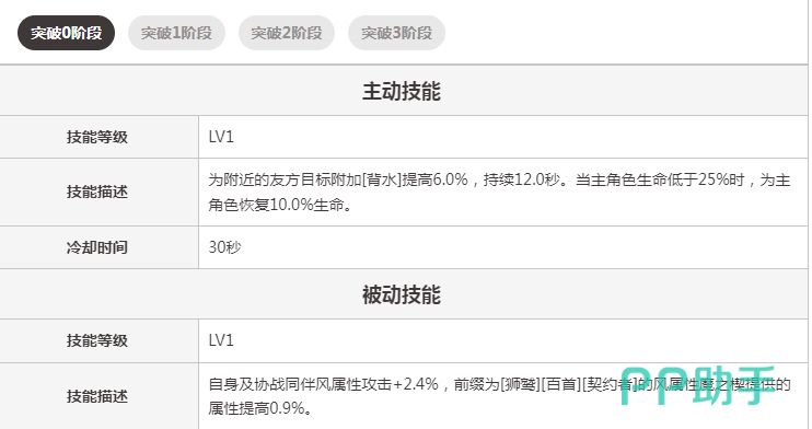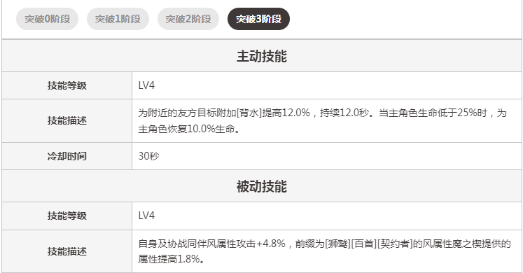 被动技能方面展现出极高的战略意义,并且会随着技能等级提升逐步强化。初始阶段可使自身及协战单位的风属性攻击力提升2.4%。若队伍中存在前缀为契约者或狮鹫的魔之楔角色,则额外增加0.9%的风攻加成。随着等级提高,最终风属性攻击增益可达4.8%。这意味着当队伍配置2至3名风属性成员时,整体输出将获得可观的叠加性提升,相当于全队长期享受一个稳定增伤buff。