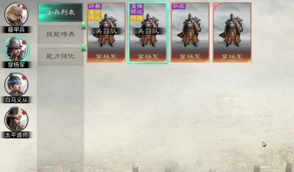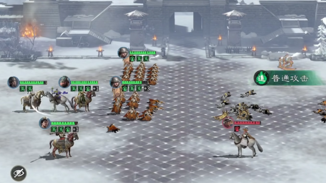 在附属士兵的选用方面,三分弓队应当搭配“陷阵营”以及两位“藤甲兵”单位,保证前排的防护能力。