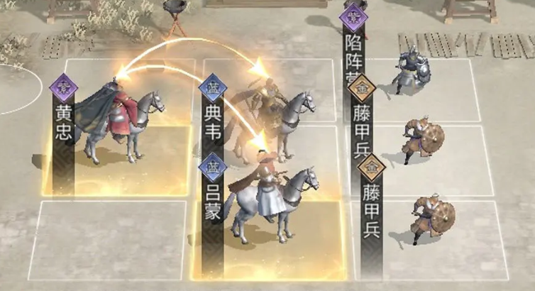 三分弓队由典韦、吕蒙、黄忠这三个角色组成,在对应阵容内,典韦负责进行前排抗压,吕蒙则负责控制,黄忠则是主要的C位。