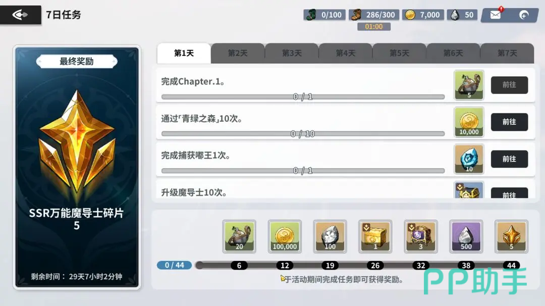 接下来在继续推动剧情进程后就能够把活动板块给解锁了,活动板块中给玩家提供了7日任务和主线任务奖励活动两个方面,这两个任务板块都能够让玩家领取到丰厚的奖励,完成活动时,七日任务大家一定要及时的完成,这里给玩家准备的奖励实在时太丰厚了,不仅有黑水晶和抽卡资源,把最终任务给完成以后还能够获得ssr万能碎片5个,主线任务奖励的话,大家每把1个章节的任务给完成就能获得黑水晶1000个哦。