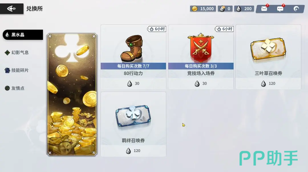 当把第一张的剧情内容给推进到第六节的时候兑换所功能就能解锁了,在兑换所中玩家可以使用货币区兑换各种物品,首日开荒这天,伙伴们可以直接用幻影气息区兑换行动力、尤尔和经验药水等物品,兑换玩这些物品以后大家就可以继续区推进主线剧情了。