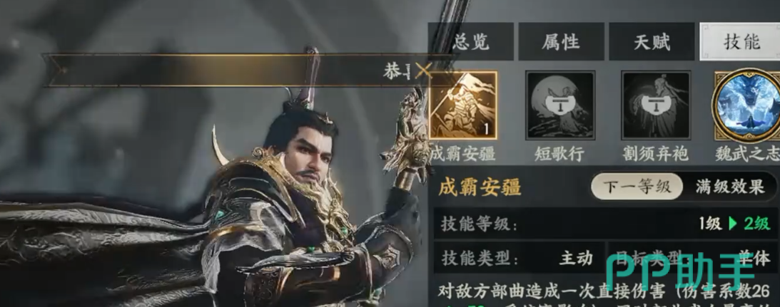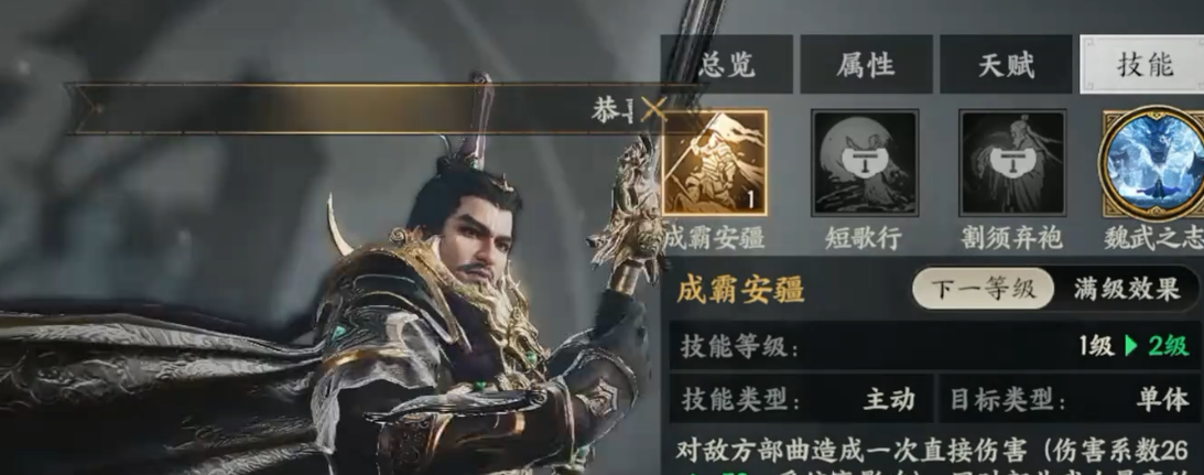 曹操有多个增益技能,其中最重要的技能就是成霸安疆,此技能有两个效果,第一对敌方单体造成伤害,第二提升我方武力最高武将的技能伤害25%,持续两回合。这就意味着曹操配合高输出武将的时候可以提升我方伤害,尤其是配合吕布这种高爆发的武将时效果更明显,曹操的技能还能提升谋略伤害,所以某些谋士型的武将也可以从曹操的技能中受益。