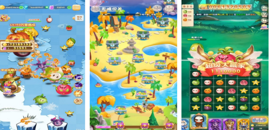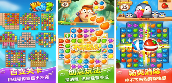 数百个创意关卡挑战十足,每个关卡都隐藏很多惊喜,也让挑战层出不穷,在开局后将会看到各种美味的水果,比如有梨或者葡萄等等,而这些水果的位置都是被随机打乱顺序的,大家仔细观察并合理滑动屏幕,只要将三个相同的水果连在一起即可快速消除,每次在消除之后,都可将分数累积到自己的排行榜中,一次性消除的水果数量越多,还可解锁炫酷道具。