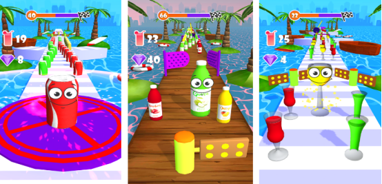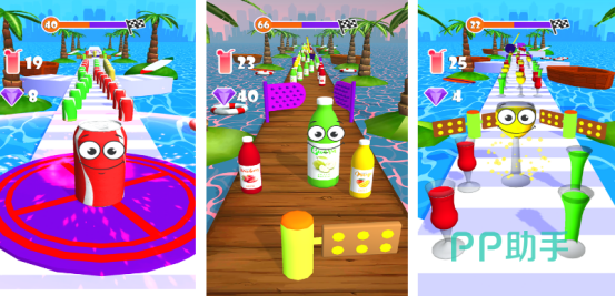 创新式的跑酷玩法,而其中的主角只是一杯可口的果汁而已,主要的要求就是左右滑动屏幕,在充满各种美味水果以及各种障碍物的赛道上逐渐完成跑酷,在跑酷的过程当中,尽可能收集更多的水果设计出美味的果汁。其中的果汁颜色多样化,但是在跑酷的过程中尽可能不要和其他颜色的果汁碰撞,否则就会让自己变小。