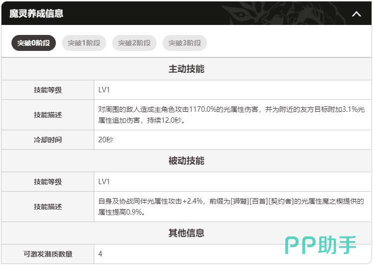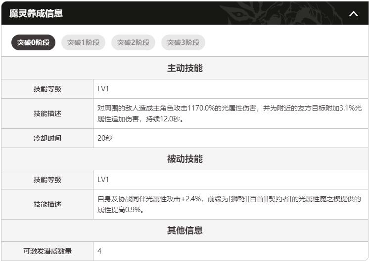 总体来看,欧泊艾尔芙是一位战术适应性强、功能全面的五星光属性魔灵。建议在培养过程中优先升级其主动技能,并合理搭配光属性魔之楔以最大化团队增益效果。无需急于将其练至满级,前期即可发挥显著作用。只要掌握其技能运作规律,并结合阵容需求进行配置,欧泊艾尔芙必将成为战场上不可或缺的关键助力。